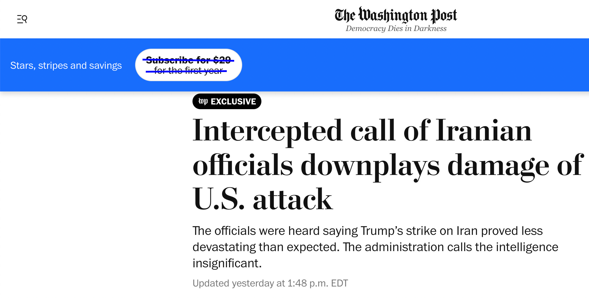 As you can see by the screenshot, American intelligence services intercepted private Iranian communications that expressed surprise at the limits of the damage done to their nuclear enrichment program by American bombs.