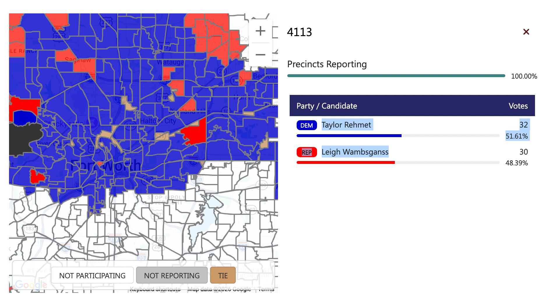 Clarityelections.com. “Election Night Reporting,” 2026. https://results.enr.clarityelections.com/TX/Tarrant/125768/web.345435/#/detail/1?linklocation=Graphical%20Election%20Night%20Reporting&linkname=January%2031,%202026%20-%20State%20Senate%20District%209%20Runoff%C2%A0%3C%2F.