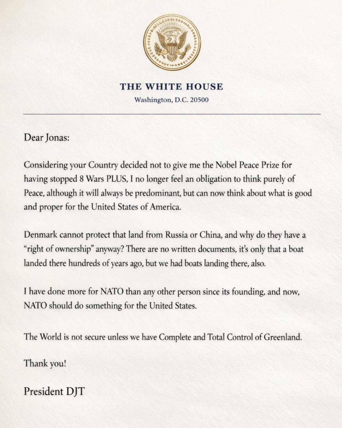 This was sent by the President of the USA to the Prime Minister of Norway, Jonas Gahr Støre. This is not satire. This is not fiction. This is an actual document sent by the president of the U.S. to a foreign nation’s head of state. Prime Minister Støre has confirmed receipt of the letter. 1