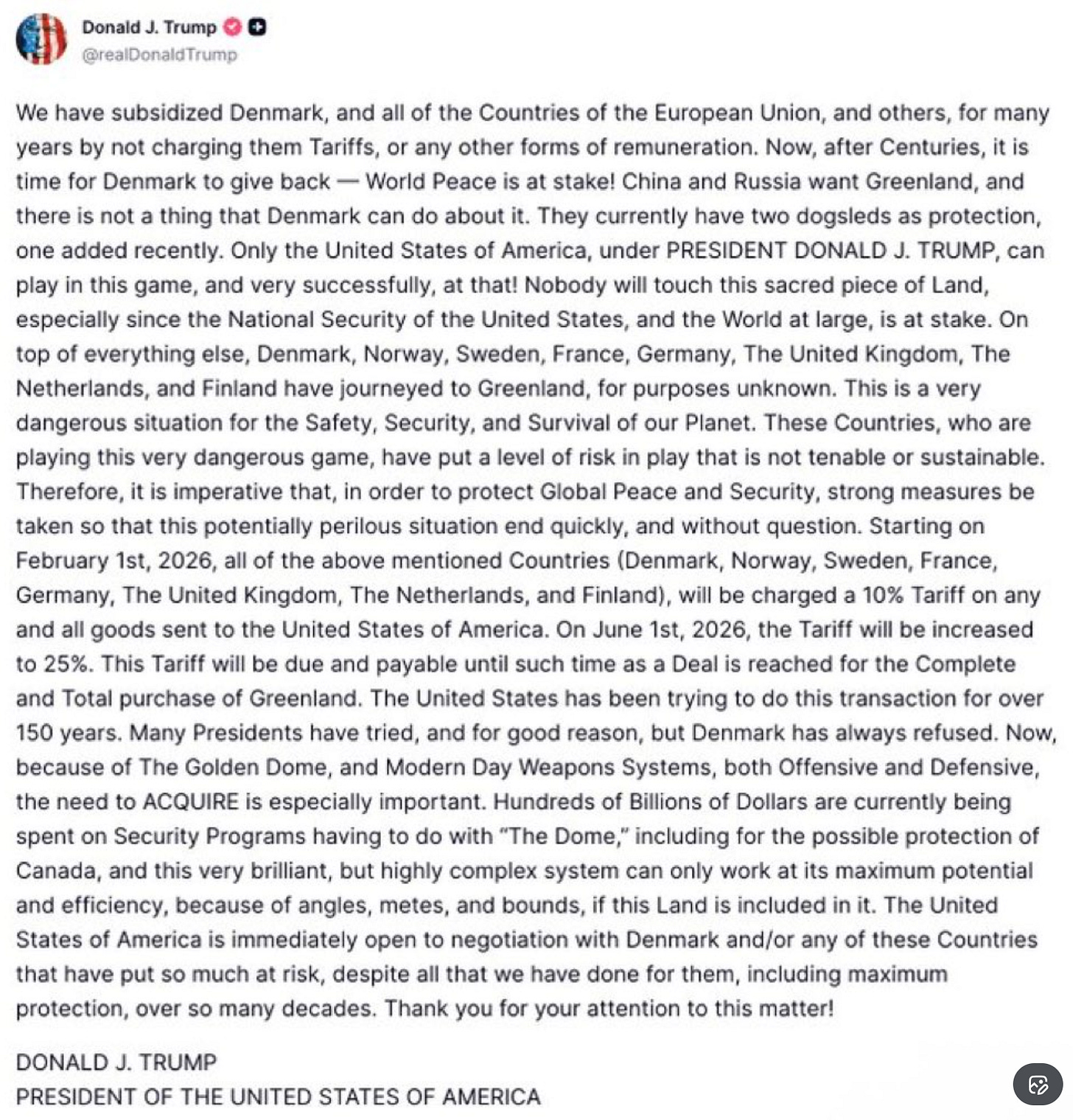 “IF YOU DON’T GIVE US GREENLAND, I WILL MAKE AMERICANS PAY MORE FOR STUFF!!!!!!!”