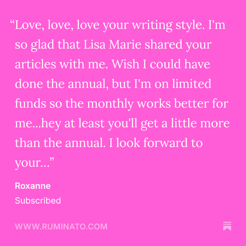 So when people honor me with a paid subscription, I’m always a little stunned, flattered, and humbled. Lately, there have been a few more of you in this regard. It’s not going to my head, that’s for sure. It’s going to my heart. And I thank you all for your trust in me.
